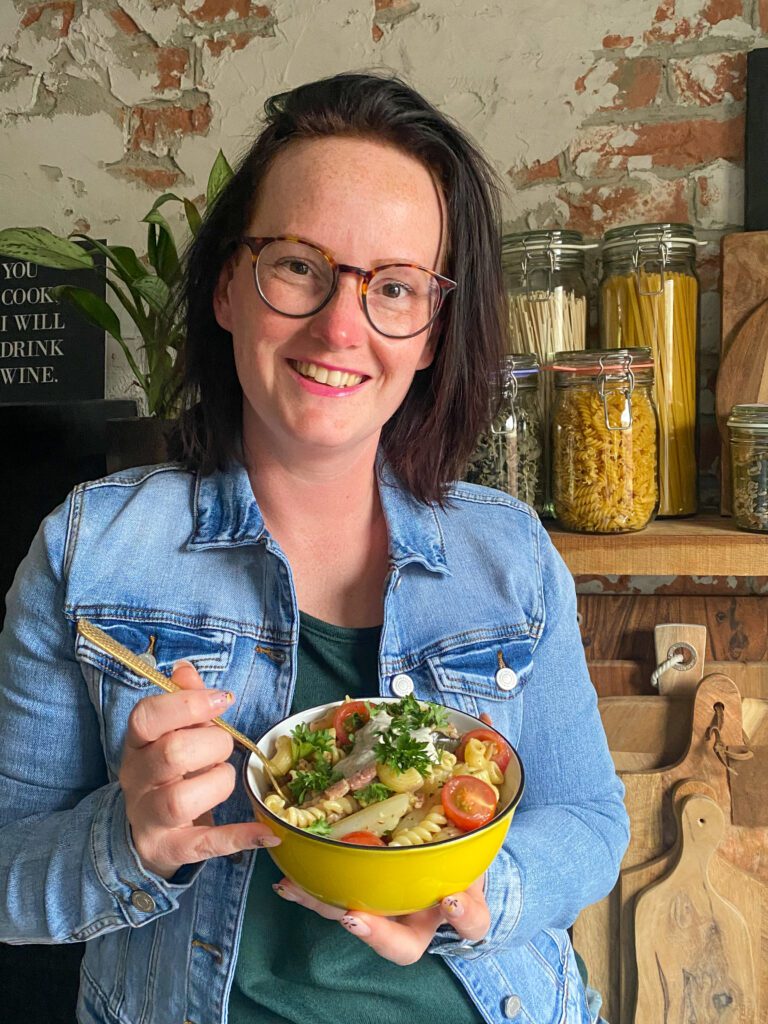 - Serveer de pastasalade met een flinke lepel van de yoghurtdressing of meng de pastasalade helemaal met de yoghurtdressing.