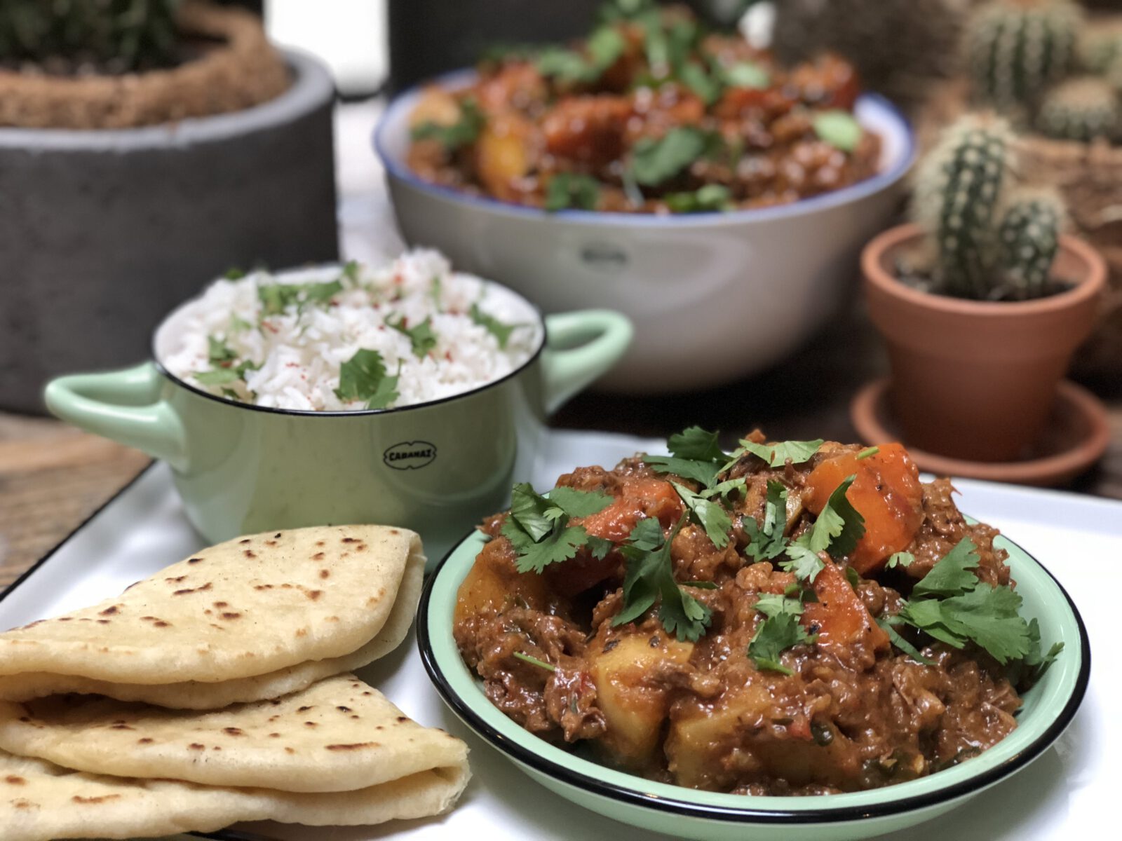 Verhit een scheutje olie en klont roomboter in de stoofpan. Bak het vlees in porties goudbruin aan en leg het vlees even apart. Fruit nu voor 10 minuten de salsa in het braadvet aan op middelhoog vuur. Leg het vlees erbij en laat het 3,5 uur stoven. Voeg dan de aardappel en wortel toe en laat nog 20-30 minuten stoven. (deksel niet helemaal op de pan) Roer er de koriander doorheen en breng op smaak met peper zout. Serveer met rijst en/of tortilla wraps