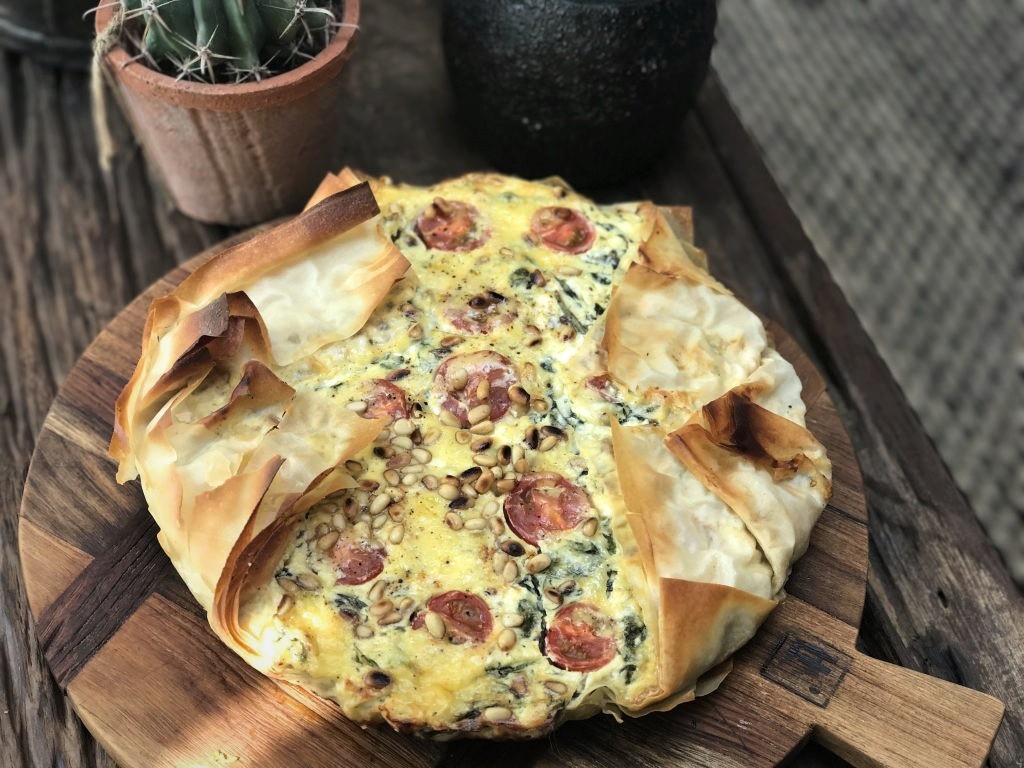 Pak een oven bestendige pan en leg hierin het bakpapier met daarop de filodeeg. Giet het spinazie mengsel erin. Verdeel de gehalveerde cherrytomaten eroverheen, de overgebleven pijnboompitten en bestrooi met de overgebleven geraspte kaas. Vouw het filodeeg over het mengsel en vet dit nog eventjes in.