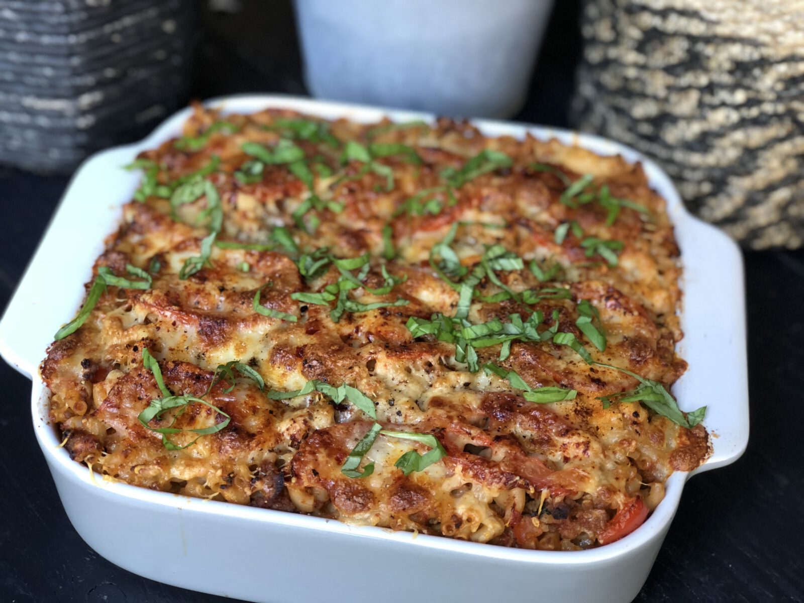 Vet een ovenschaal in. Giet de macaroni af, besprenkel met olijfolie extra vierge en meng de macaroni door de saus. Scheur een handje verse basilicum door de macaroni en schep de macaroni in de ovenschaal. Leg er de plakjes tomaat op, bestrooi met geraspte kaas en scheur de mozzarella eroverheen. Breng eventueel nog extra op smaak met vers gemalen zwarte peper en een snuf pul biber/chilipoeder. Bak de macaroni ovenschotel in 10 minuten goudbruin.