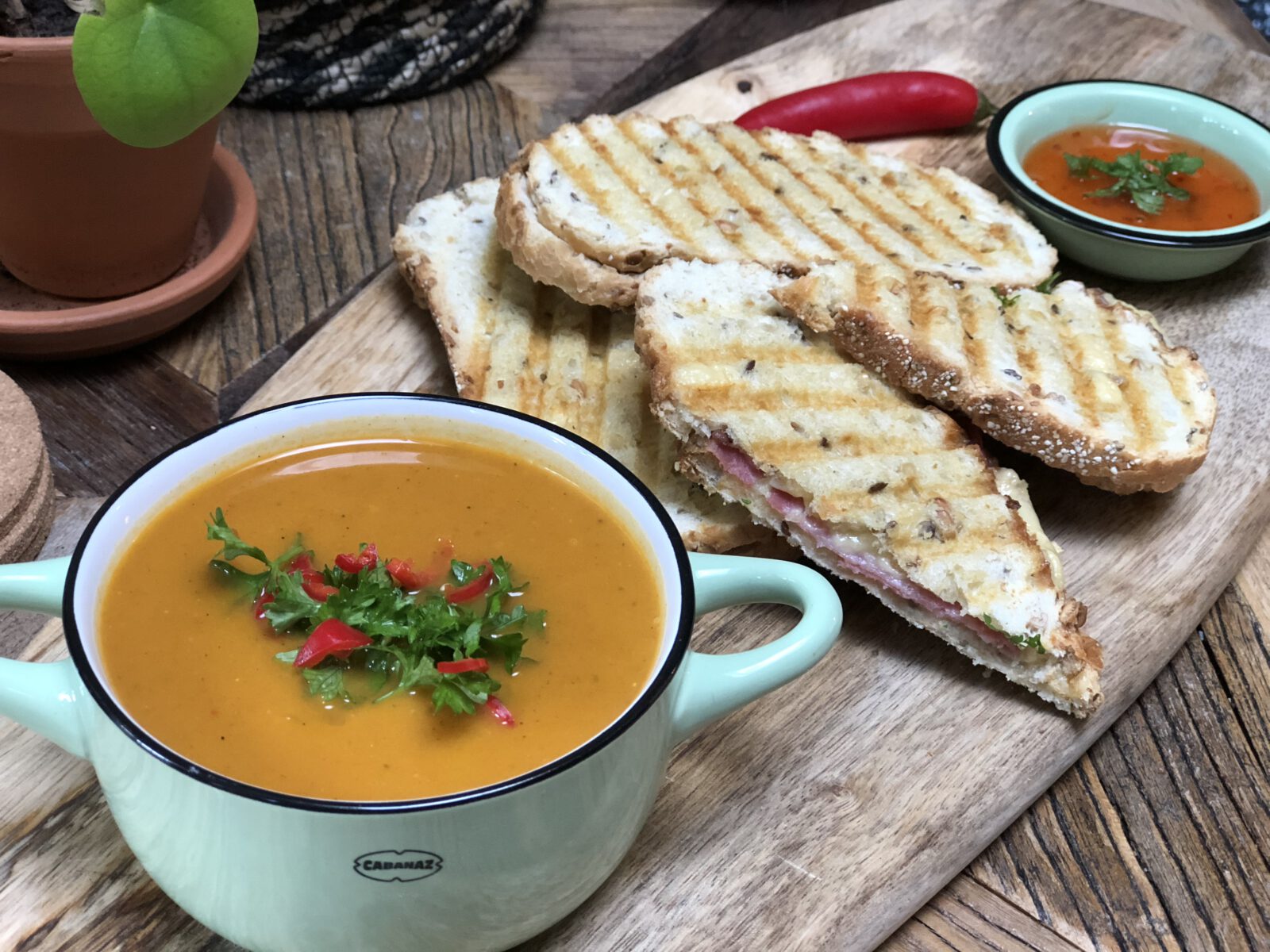 Verhit 1 el roomboter en een scheutje olie in een stoofpan. Fruit de uien met de knoflook en de rode peper. Voeg 2 tl kerriepoeder, 2 theelepels paprikapoeder en een 1/2 tl chilipoeder toe. Bak dit kort mee. Voeg dan 1 el tomatenpuree toe en bak ook weer kort mee. Voeg de pompoen toe en bak kort aan. Vervolgens giet je er 750 milliliter water bij en verkruimel je het bouillonblokje. Roer alles door. Leg de deksel op de pan en laat 30 minuten zachtjes koken. Pureer de soep met een staafmixer en breng op smaak met peper, peper en 1 tl nootmuskaat.