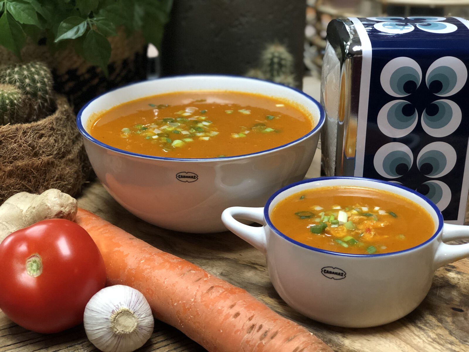 Verhit een scheutje olie in een stoof/soep pan en fruit de uien met de knoflook, gember, rode peper, kerriepoeder, paprikapoeder en de sambal. Voeg de tomaten, geraspte wortelen en 2 verkruimelde bouillonblokjes toe, bak dit even kort mee. Voeg 800 milliliter water en 1 el suiker toe. Leg de kipfilet in de pan en laat de soep met de deksel op de pan 30 minuten zachtjes koken. Haal de kip uit de pan, trek deze uit elkaar en pureer de soep. Voeg de kip terug, breng op smaak met peper en/of zout en roer de bosui erdoorheen.