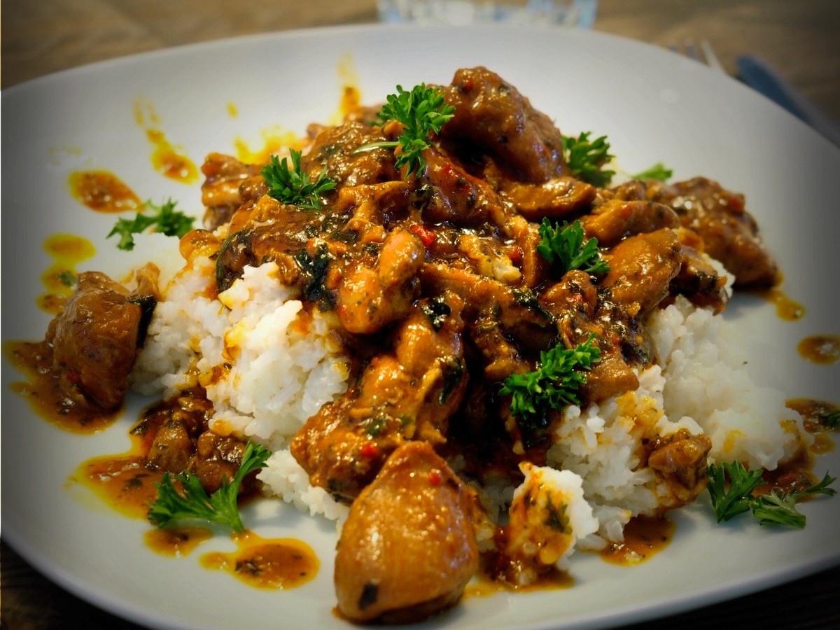 Verdeel de rijst over 4 borden, schep de kruidige kip eroverheen en bestrooi met de overgebleven peterselie