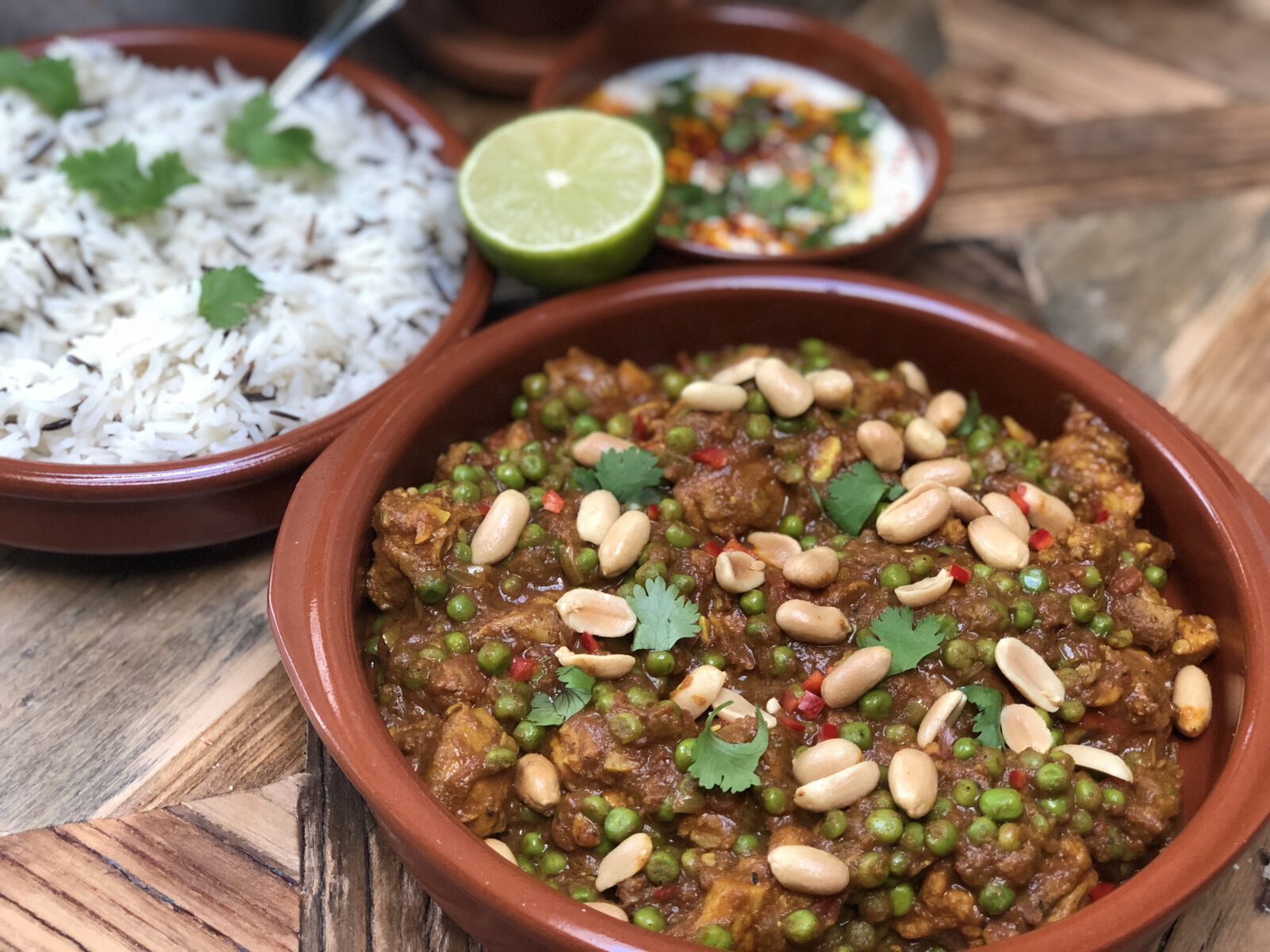 Meng in een mengkom de kip met 2,5 tl kurkuma, 1 tl chilipoeder en een flinke snuf gemalen zwarte peper. Verhit de roomboter en een scheutje olijfolie in een wok/hapjespan. Fruit de uien met de knoflook, gember en rode peper. Voeg de kip toe en bak deze rondom goudbruin aan. Voeg het blikje tomatenblokjes toe samen met een snuf zout, 2 tl komijnpoeder en 2 tl gemalen koriander poeder. Roer alles goed door en leg de deksel (niet helemaal gesloten) op de pan. Laat de kip 15 minuten pruttelen. Voeg dan naar smaak limoensap toe, 200 gram diepvries erwtjes en breng op smaak met peper en/of zout. Zet het vuur nu hoger en laat zonder deksel op de pan de kip nog 5 minuten zachtjes koken. (vergeet niet te roeren) Bestrooi met de vers gehakte koriander en gezouten pinda's.