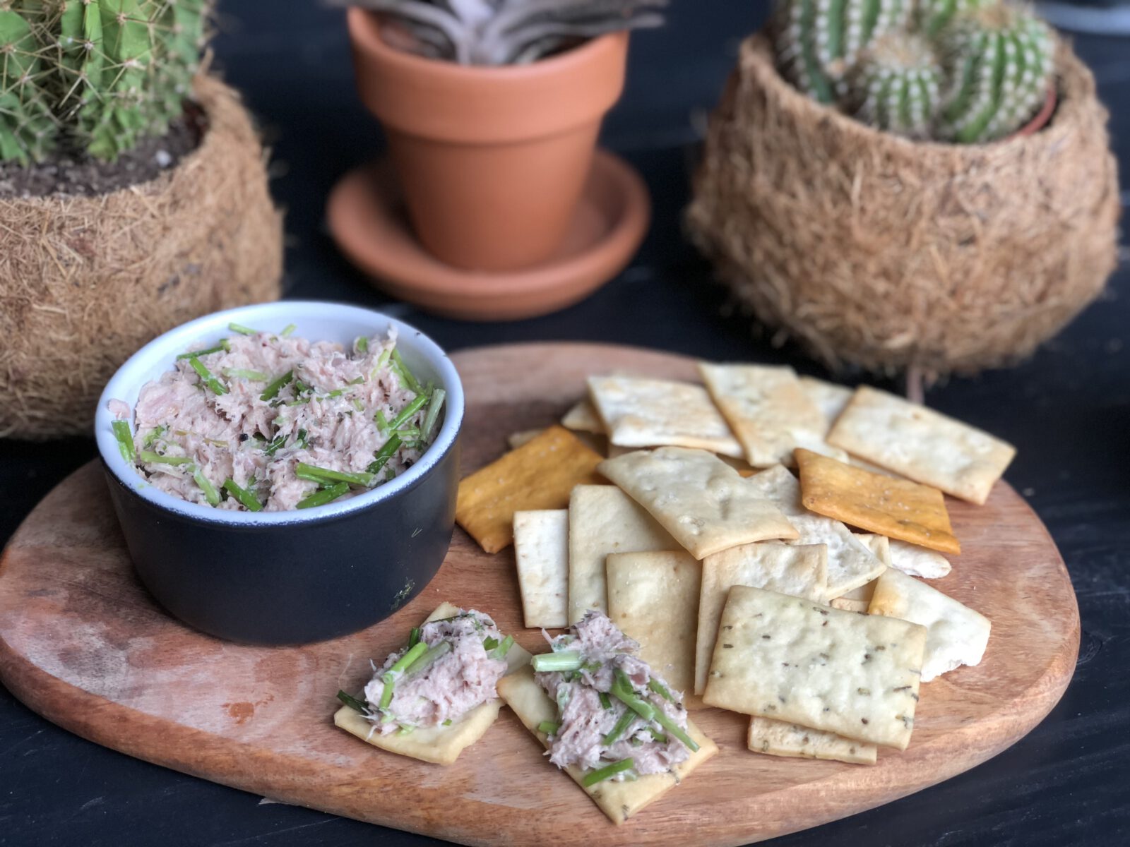 Giet de tonijn af. Meng de tonijn met 1 of 2 eetlepels mayonaise (afhankelijk van hoe romig je hem wilt hebben), snufje zout, flinke snuf gemalen zwarte peper, bieslook en een snufje knoflookpoeder. Laat de tonijnsalade het liefste wel eventjes in de koelkast staan. Dan kunnen de smaken goed intrekken. Ook lekker is om een klein beetje citroensap toe te voegen, hierdoor wordt de salade iets frisser van smaak.
