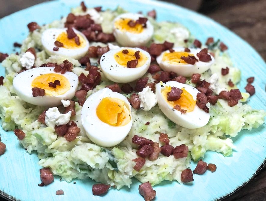 Kook in de tijd dat de aardappelen op staan de eieren en bak tevens de spekblokjes krokant. Serveer de prei stamppot met de spekblokjes en ei. Bestrooi eventueel nog met wat extra gemalen peper. (ook lekker is om er wat chilivlokken overheen te strooien)