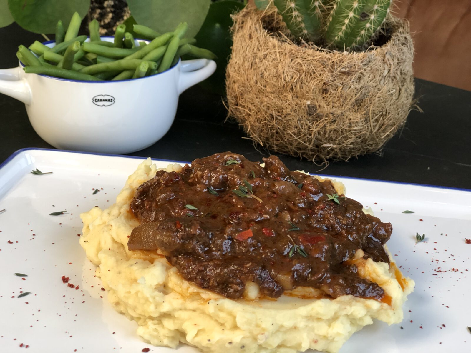 Bestrooi het vlees met peper, zout en de bloem. Verhit een scheutje olijfolie en roomboter in een stoofpan. Bak het vlees rondom goudbruin aan en haal het vlees uit de pan. Bak in het braadvet de uien met knoflook, ontbijtspek, rode peper, sambal badjak, tomaten en de gedroogde provencaalse kruiden. Als de uien glazig zijn, voeg dan 2 tl tomatenpuree en 1 el suiker toe en bak dit kort mee. Leg het vlees terug in de pan en verkruimel het bouillonblokje erbij en giet de wijn in de pan. Roer alles even goed door, leg een paar takjes tijm erbij en leg de deksel op de pan. (niet helemaal maar laat een klein stukje openstaan) Laat het stoofvlees minimaal 4 uur pruttelen. Mocht de saus niet indikken, haal dan na 3 uur de deksel helemaal van de pan.